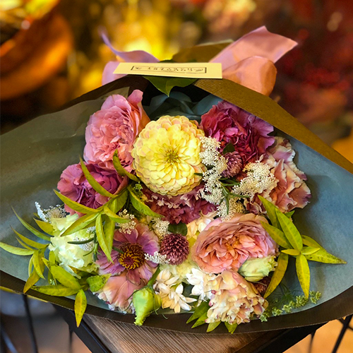 雰囲気あるくすみピンクにオータムグリーンを繊細に合わせました。心地よい秋風が感じられるブーケです。