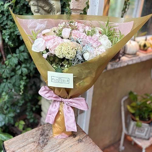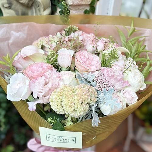 淡いピンクとホワイトの透明感あるブーケです。繊細に重なり合う花びらと優しい表情に心魅かれます。
