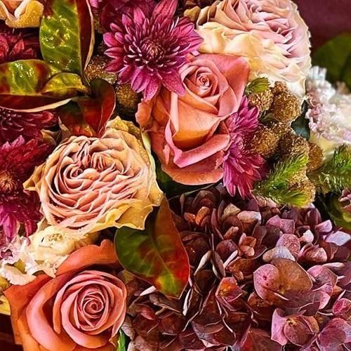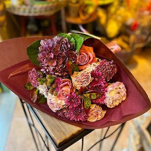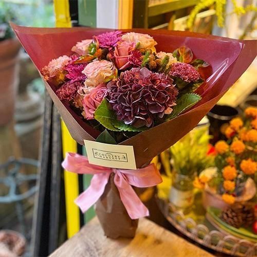 くすみ色のピンク&パープルを集めた、上品で大人の雰囲気漂うブーケです。