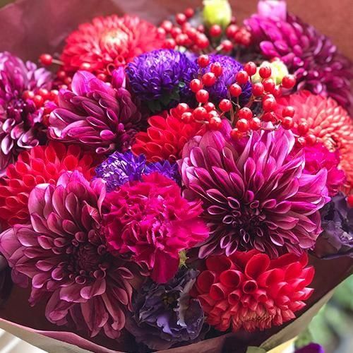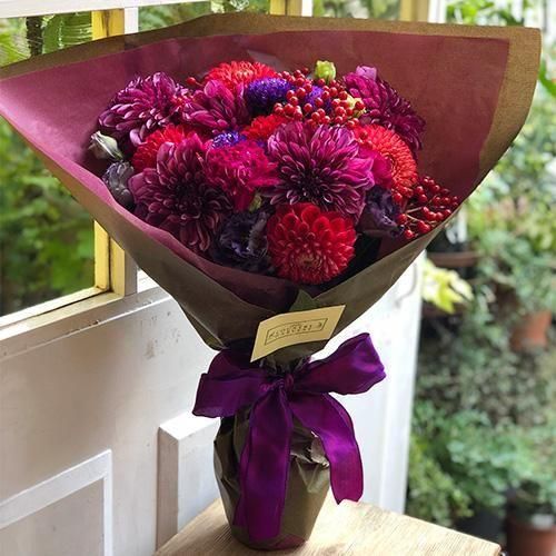 深く熟れゆくベリーを彷彿とさせるカラーでデザインしました。艶やか美しくに重なり合うボリュームたっぷりのブーケです。