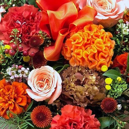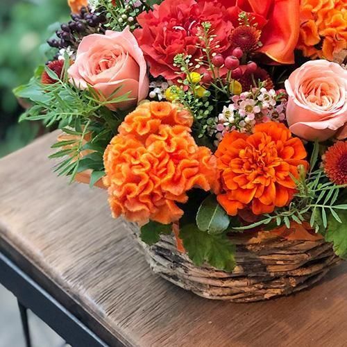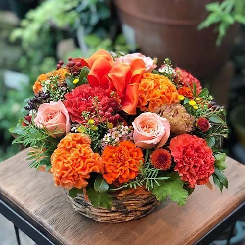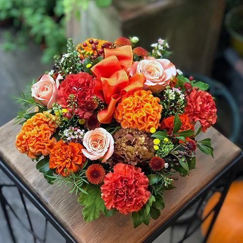 紅葉を思わせるオレンジ色の花と、秋の実ものを集めたアレンジメントです。鮮やかな季節の便りを贈りましょう。