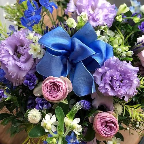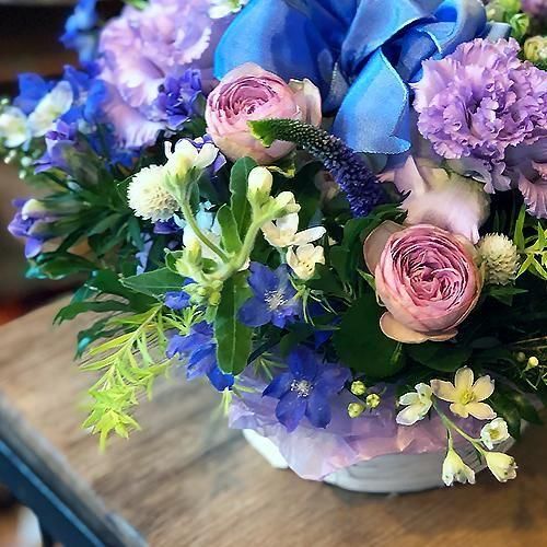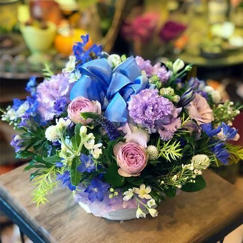 優しい雰囲気に満ちた、ラベンダー&ブルーの甘さを抑えた大人色のアレンジメントです。ホワイトの小花たちが空間を美しくつなぎます。