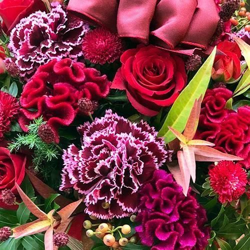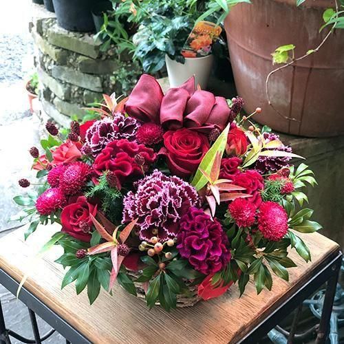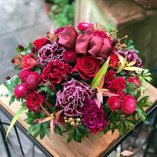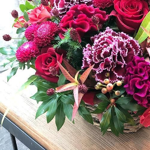 深みのあるレッド&ボルドーが華やかでスタイリッシュなアレンジメントです。豊穣の実ものや紅葉に秋の深まりを感じます。