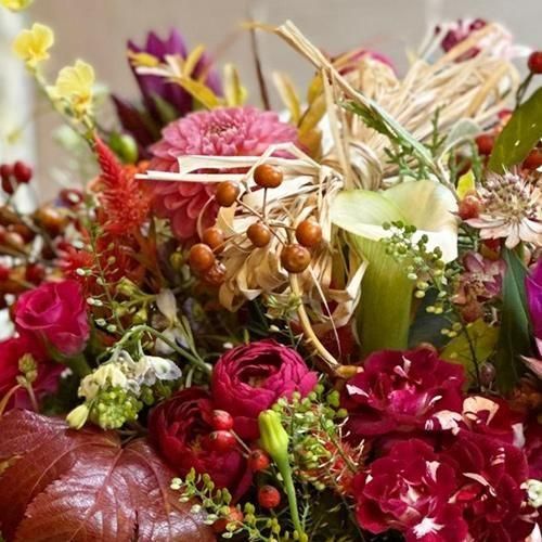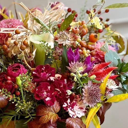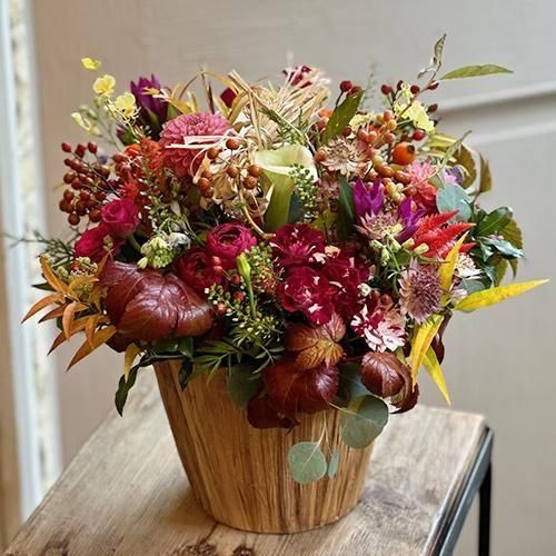 ボルドーカラーをメインに移ろいゆく秋の情景を美しく華やかにデザインしました。情熱の色をナチュラルに贈りましょう。