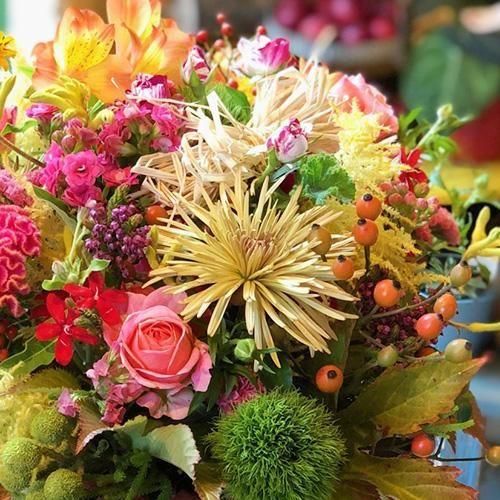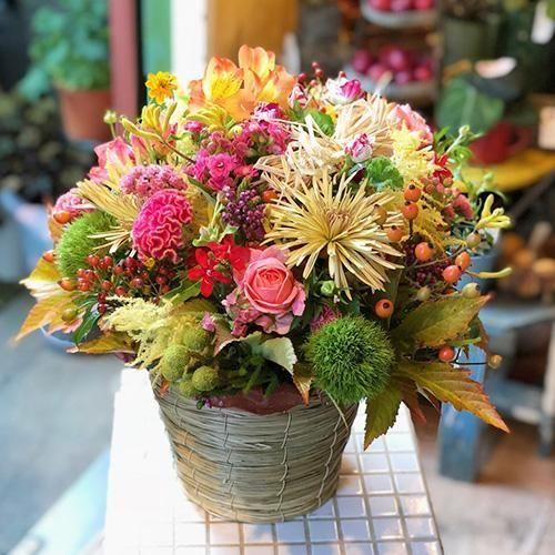 温かみのあるピンクやオレンジをベースに、優しく色を塗り重ねるようにデザインしました。宝石のような木の実と花が豊穣の秋を伝えます。