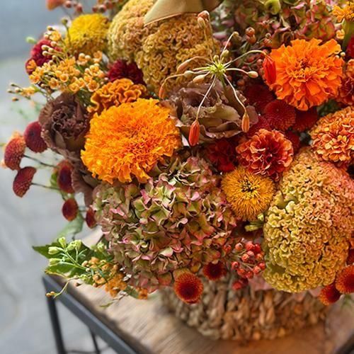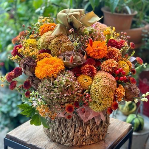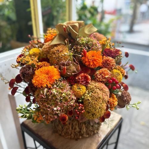 温かみのあるオレンジをベースに秋色を塗り重ねるようにデザインしました。木の実と花たちが豊穣を伝えてくれます。